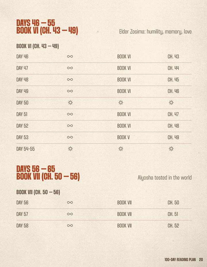 OR, you could go absolutely crazy with me and try to conquer Brothers Karamazov in forty days. But it’s actually not that crazy. It’s about an hour to an hour and a half of reading each day, which is something I already have penciled into my daily routine. The goal is to complete 20-25 pages each day.